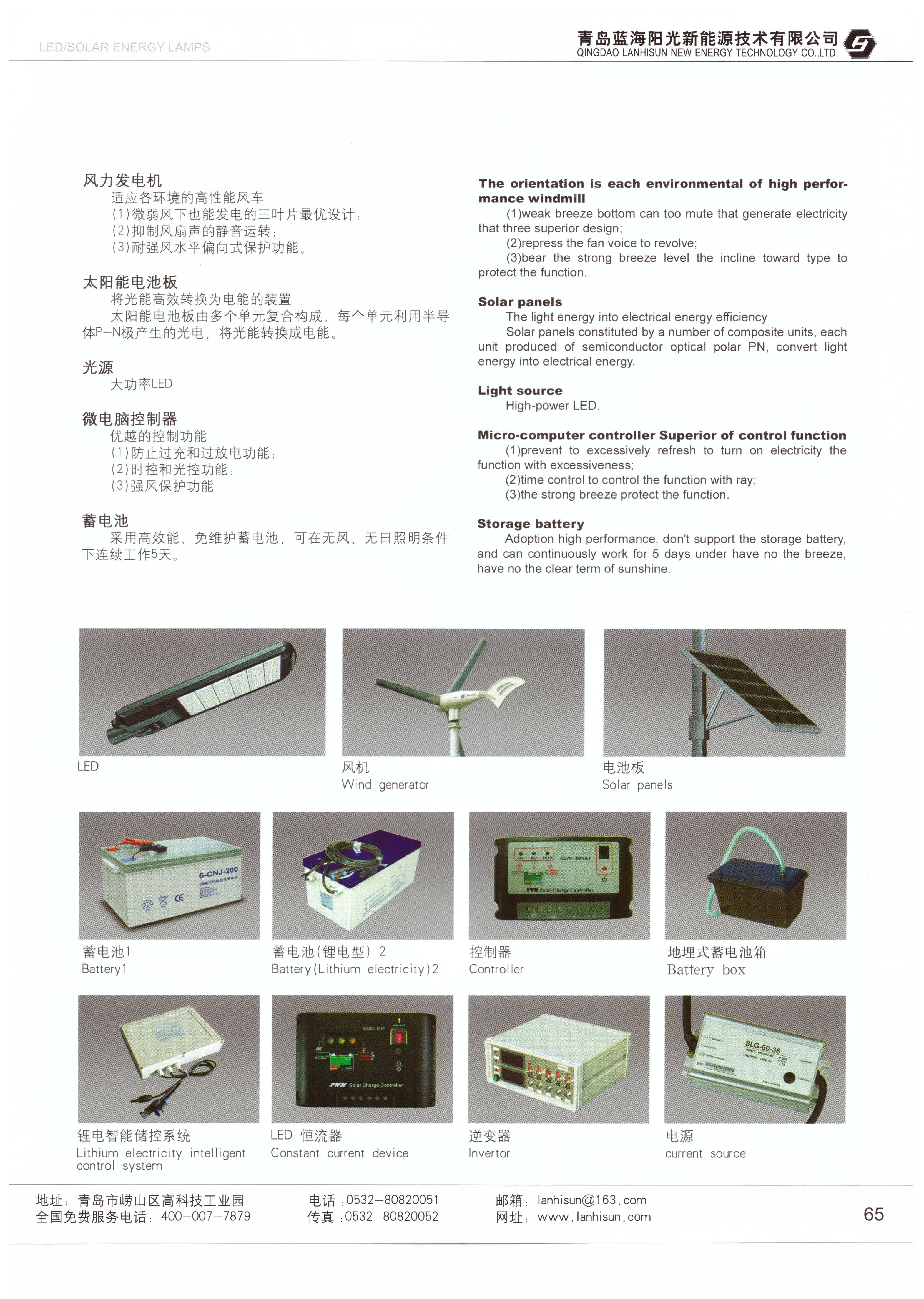 • 控制系統:即風光互補路燈控制器,它集光控亮燈、時控關燈、自動功率跟蹤、自動泄荷、過充過放保護等功能于一身,可對蓄電池的充放電過程進行精確控制,確保系統穩定運行。