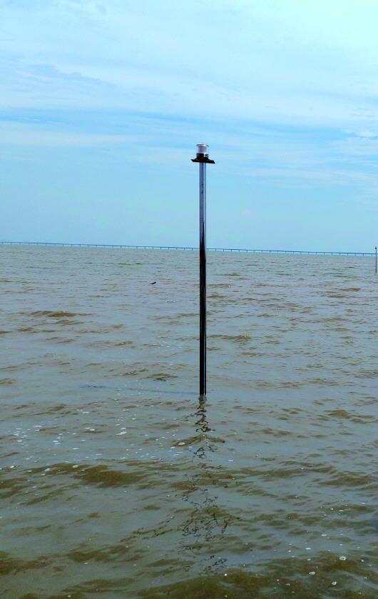 設(shè)置在灘涂上的路燈,遠(yuǎn)處膠州灣大橋清晰可見