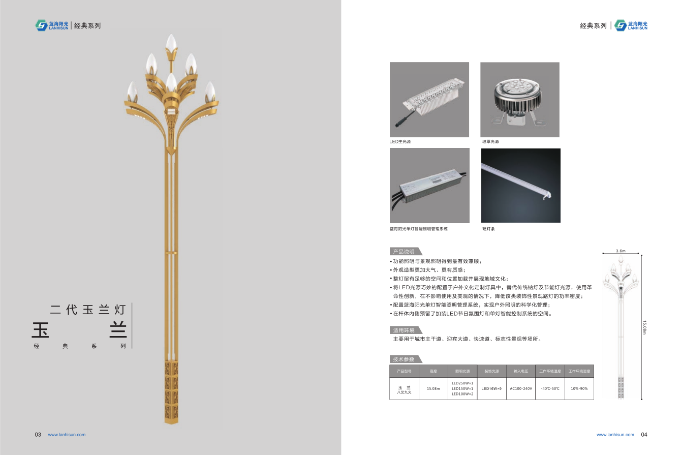 1、高度為6-16米; 2、花葉光源為4組LED光源,色溫2500-6500K,燈罩光源為9只LED裝飾光源,每個光源功率為30-60W; 3、LED驅(qū)動電源壽命可達五年; 4、整體熱鍍鋅噴塑,保證燈桿15年不生銹; 5、可以根據(jù)使用地區(qū)的地域文化、產(chǎn)業(yè)特點等進行文化定制;