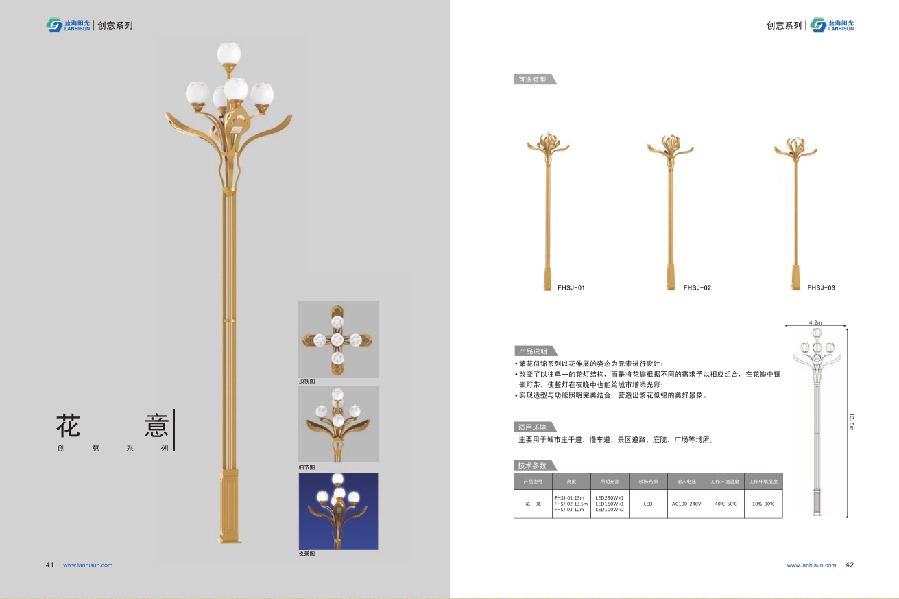 1、高度為6-16米; 2、花葉光源為4組LED光源,色溫2500-6500K,其余光源為LED裝飾光源,每個光源功率為30-60W; 3、LED驅動電源壽命可達五年; 4、整體熱鍍鋅噴塑,保證燈桿15年不生銹; 5、可以根據使用地區的地域文化、產業特點等進行文化定制;